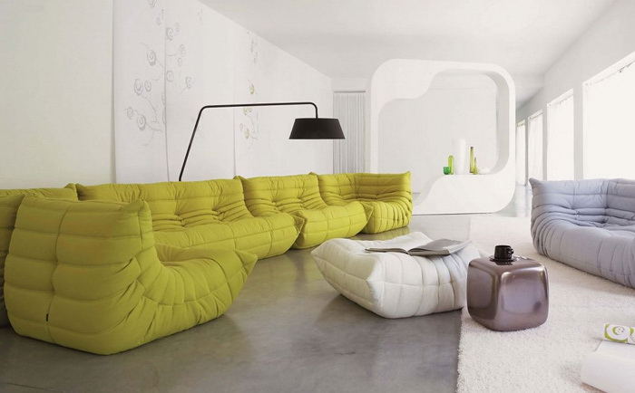 Но безусловно тебя впечатлили ярко-синие кресла, неимоверно лимонно-жёлтые стёганые диваны, голубые и желтые пуфы.