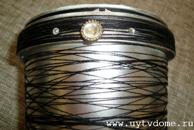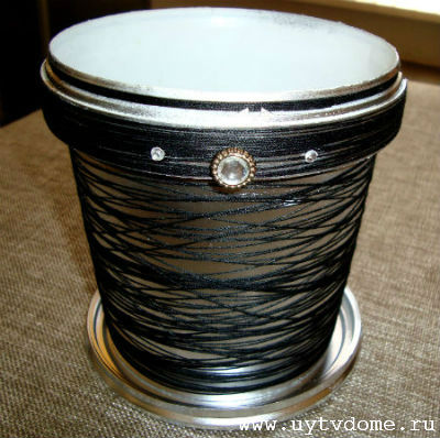Здесь, помимо черных ниток, использовались также серебристые, посмотрите, может быть Вам такой декор больше понравится. Экспериментируйте не только с оттенком краски, но и с цветовой гаммой ниток, ведь удачно комбинируя оттенки можно создавать яркие, сочные кашпо (красные, желтые, розовые, оранжевые и т.д.). Все зависит от Вашей фантазии!
