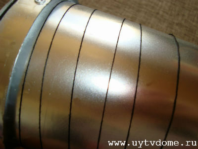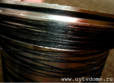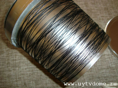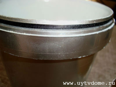 2. Затем берем катушку черных ниток, и аккуратно обматываем верхнюю часть будущего кашпо (там, где находится углубление, бороздка). Кончик нитки фиксируем клеем ПВА (после высыхания данный клей вообще не видно).
