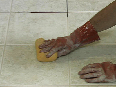 • Получившийся мыльный раствор при помощи губки наносят на плитку;