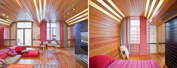 Как обычно в интерьере многое зависит от света. Несколько нестандартно оформленных светильников — длинных полупрозрачных полос, за которыми скрываются лампы, установленных посреди потолка — и интерьер совершенно преображается. В таком дизайне можно оформить комнаты для молодежи, креативные гостиные и т.п.