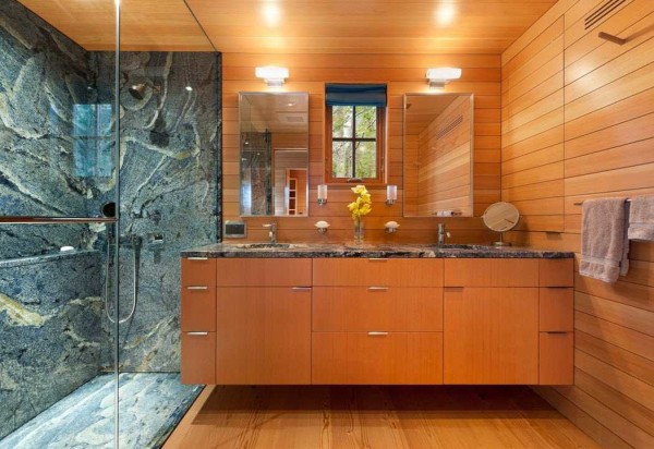 Используется вагонка и в отделке ванных комнат. Пропитке тут необходимо уделить максимум внимания, но если вентиляцию в ванной сделать на уровне, пропитку — с защитой от влаги, то проблем быть не должно. А интерьер, согласитесь, очень интересный — теплые тона древесины в сочетании с ярким мрамором — отличный ход.