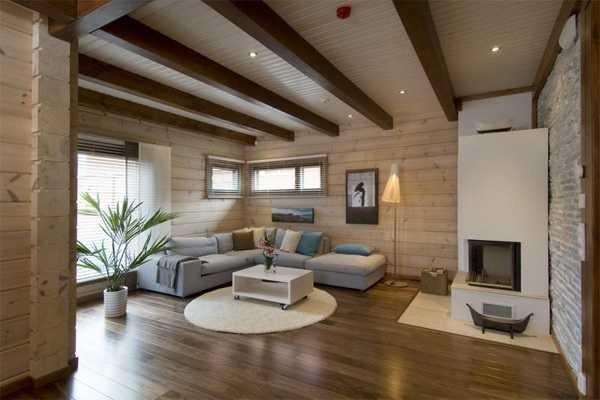 Как бы в противовес — светлые стены. Вагонка выбелена, а балки окрашены в темный цвет. Несмотря на традиционные материалы, используемые столетиями, вид у такого помещения — современный и стильный.
