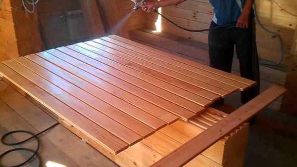 Если необходимо мебельное качество покраски, слоев еще больше: сначала наносится морилка, потом два слоя грунта. После высыхания шлифуется до полной матовости поверхности сначала зерном 280, затем 320, после удаления пыли наносится финишный слой — лак. Пример такой работы в видео.