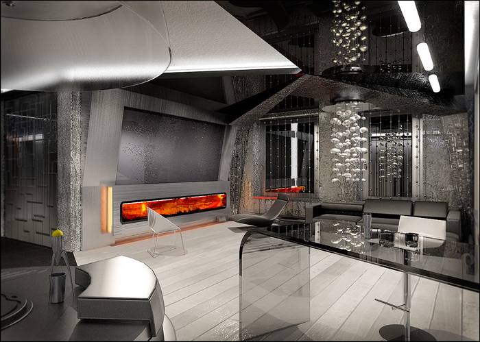 Особенно удачным и гармоничным выглядит интерьер зала, в котором использован классический контраст черного с белым, а также черный с синим, или черный с серебристым цветом.