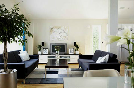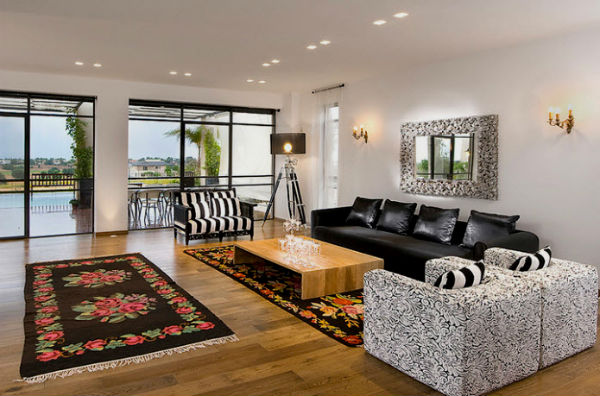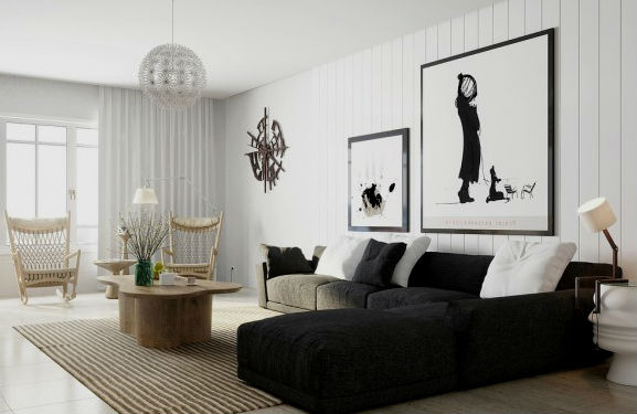 ► Любители строгих контрастов, могут позволить себе оформление интерьера в модных бело-черных тонах, в этом случае обои вполне могут включать в свое оформление черный принт, диваны могут украшать белые подушки, а статуэтки, ковры и вазы могут быть совмещенными бело-черными. Здесь можете почитать статью, посвященную полоскам в интерьере.