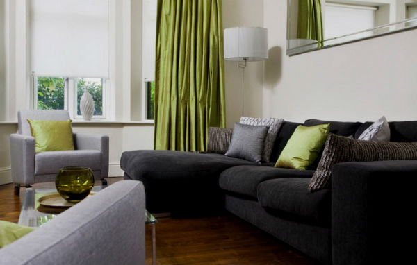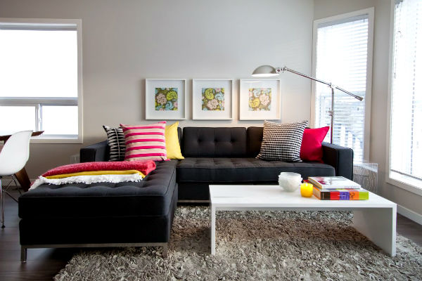 ► Если Вы считаете бежевые или серые тона скучными, тогда смело подбирайте обои более жизнерадостных тонов, таких как светло-оранжевые, желтые или салатные. Кроме того мрачность черного цвета можно сгладить при помощи множества ярких декоративных подушечек, а также сочных оттенков ваз, статуэток, цветочных горшков.