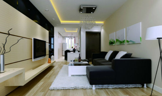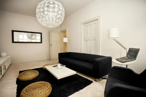 ► Шикарно и даже торжественно будет смотреться черный диван на фоне белоснежного, глянцевого потолка, а также стен оформленных белыми обоями в серебристый замысловатый узор. К такому интерьеру можно подобрать белую люстру с черным хрусталем, а также несколько аналогичных настенных бра.