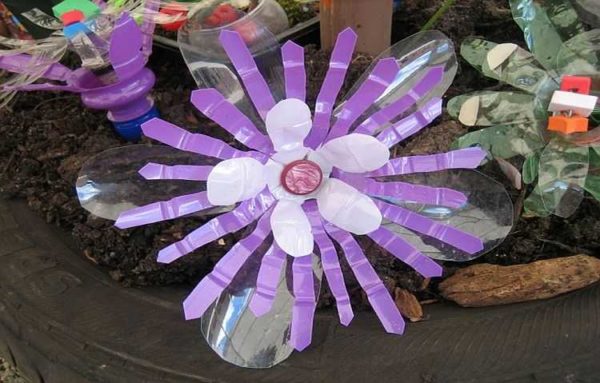 Для начинающих рукодельщиков можно попробовать делать цветы из пластиковых бутылок простых форм для украшения сада. В этом случае можно использовать и молочные ёмкости. Чтобы не красить пластик, поищите цветные. И не столь важно прозрачные они будут или нет. Их можно комбинировать, получая разные по форме цветы.