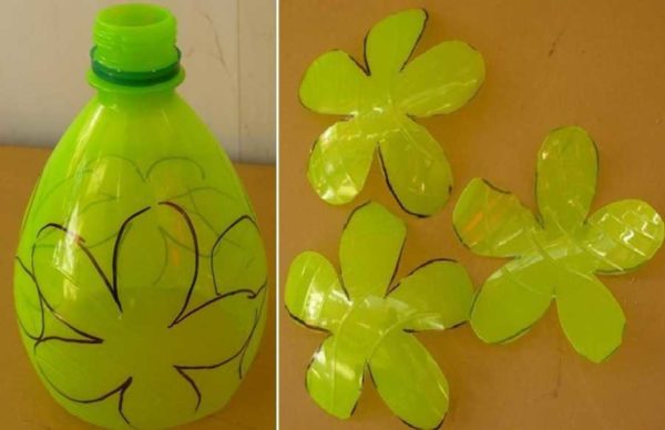 - Берем бутылку, на ней рисуем маркером контуры цветка. Рисовать можно на любой части. Просто лепестки будут изогнуты в разной степени.