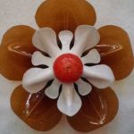 - Когда краска высохнет, можно собирать цветок, совмещая отверстия в центре, разворачивая лепестки так, как вам нравится. Закрепить их можно ниткой или тонкой проволокой с продетой пуговицей или большой бусиной. Пуговица или бусина — сердцевина. Можно совместить лепестки и скрепить каплей клея, а сердцевинку оформить нарезанной в лапшу полосой того же пластика (или другого цвета).