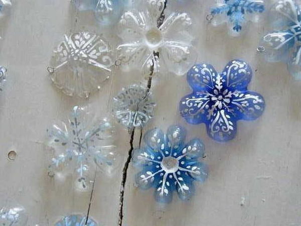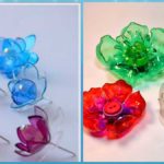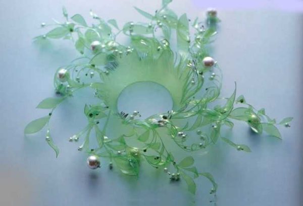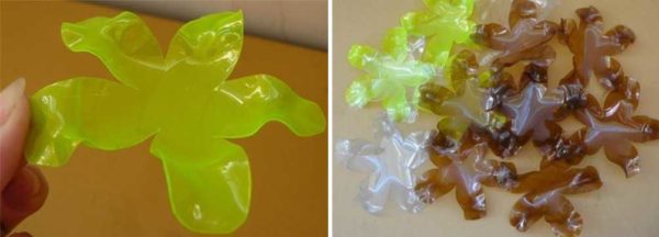 Ещё вариант — нарезать от горлышка на полоски равной ширины — 1-1,5 см, отогнуть их (прогрев немного у основания). Средний венчик сделать из боковой части молочной бутылки или покрасить прозрачный пластик акриловой краской.