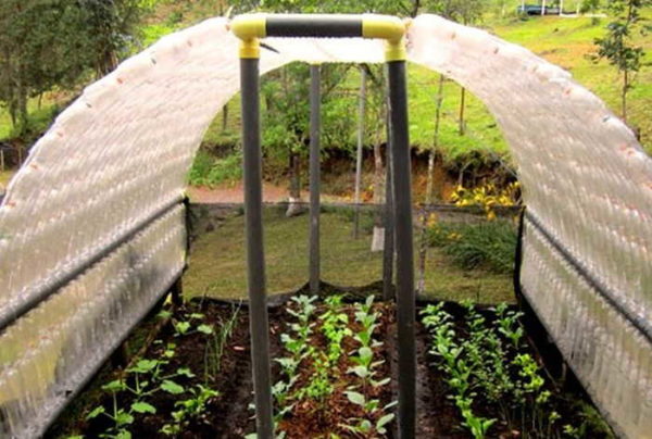 Из пластиковых бутылок можно построить теплицу или парник. В этом случае используют только прозрачный пластик, так как надо чтобы свет проходил в достаточном количестве. Для строительства сарая, наоборот, имеет смысл подобрать пластик потемнее — меньше будет видно что внутри.