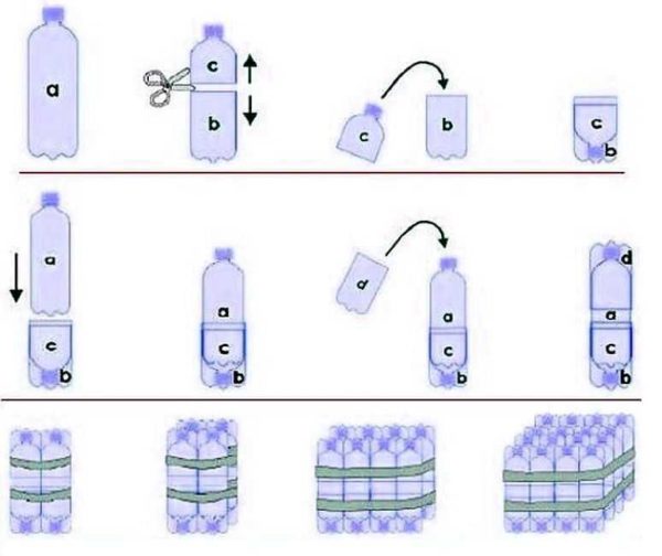 Основная идея — насыпать в бутылки сыпучий материал, закрутить их крышками и использовать как кирпичи. Наполняют бутылки песком, грунтом. Песок предпочтительнее, так как в грунте слишком много растительных остатков, которые могут гнить. Его надо просеять, высушить, наполнить бутылки, хорошо уплотнить, досыпать ещё до самого верха. Получаются своеобразные кирпичи.