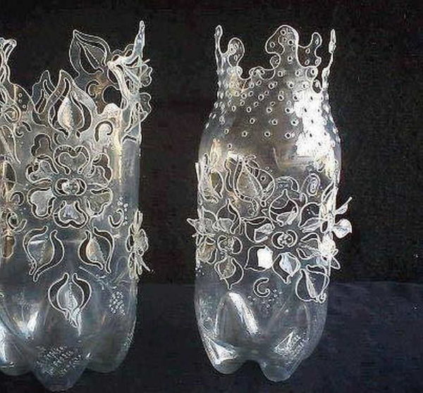 Сделать вазу из пластиковой бутылки — что может быть проще… Просто отрезать горлышко и готово. Но есть техника, которая позволяет получить узорные стенки. Вам понадобится паяльник с самым тонким жалом. Мощность у него должна быть не слишком высокой. Дальше все просто: при помощи разогретого жала выжигаете узоры.