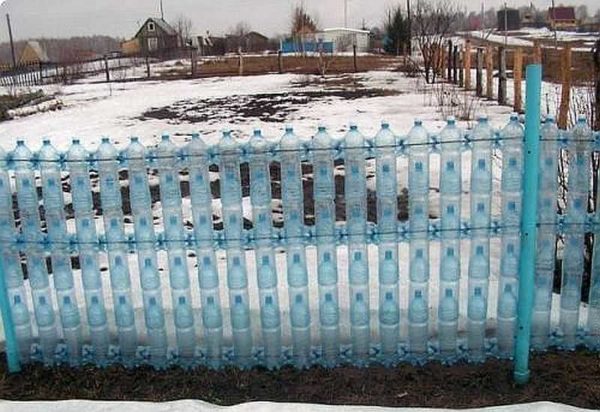 Еще можно сделать из пластиковых бутылок заполнение для забора. Рамку изготовить, скажем, из древесины, а из фигурных емкостей и их частей придумать красивое заполнение.