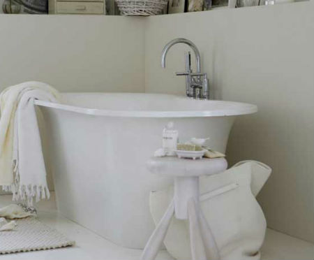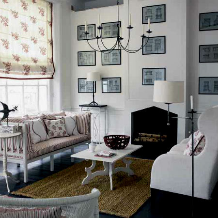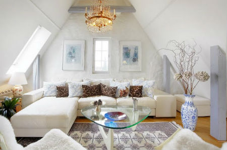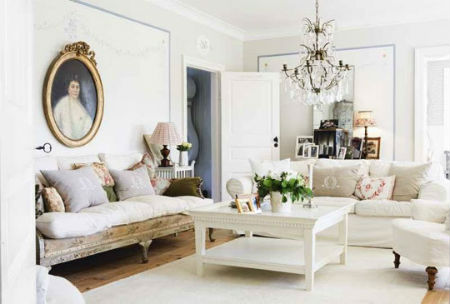На фоне белых стен (было рассмотрено выше) в гостиной комнате будет великолепно смотреться белоснежный диван, покрытый цветастым пледом и множеством подушек, создающих концепцию «творческого беспорядка». На полтона темнее обивки дивана можно приобрести несколько комфортных кресел, на пол постелить небольшой круглый, овальный или прямоугольный ковер, сочетающийся по тону с обивкой мебели или пледами. Журнальный столик может быть изготовлен как из дерева, так и из металла с декоративной ковкой, но главное условие — покраска в белый цвет.