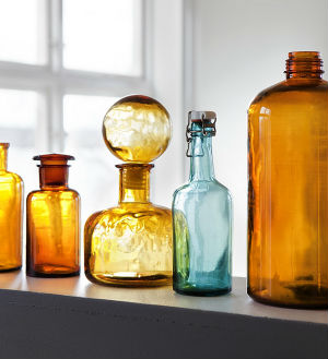 - Разнокалиберные стеклянные бутылки (как разрезать бутылку ниткой можно посмотреть здесь, а изучить декор стеклянными бутылками — здесь);