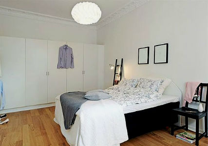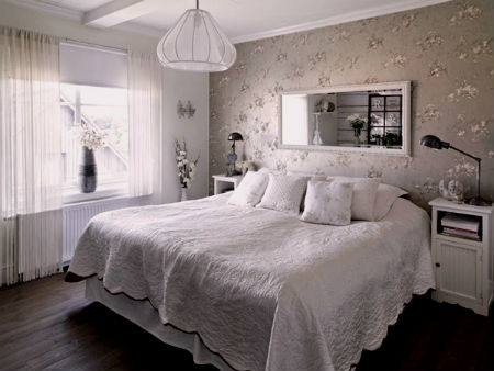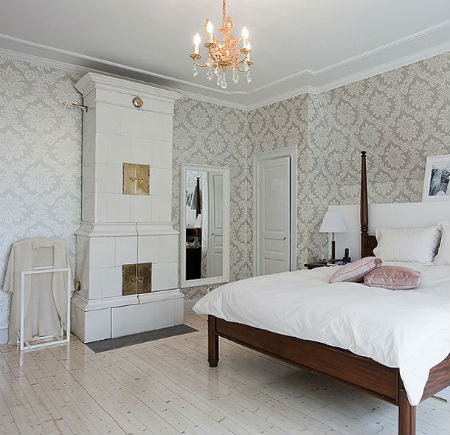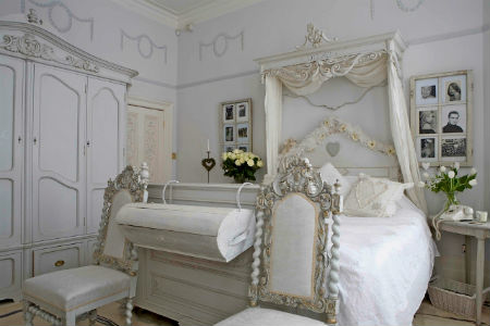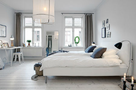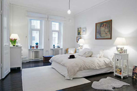 Стены спальни, как в прочем и потолок, должны быть покрыты светлой краской, а поверхность пола, вполне может иметь оттенок натурального дерева. Прикроватные тумбочки, шкаф, комод и туалетный столик можно приобрести, как в белом цвете, так и цвете натурального дерева. Здесь же, в спальне будет вполне уместно смотреться плетеное кресло, пуфик, а также соломенные жалюзи. Что относительно декора, как и в случае с гостиной, шведский дизайн интерьера спальни лучше дополнить напольными и настольными вазами, высокими крашеными канделябрами, картинами в простоватых рамах, зеркалами, а также живыми цветами.
