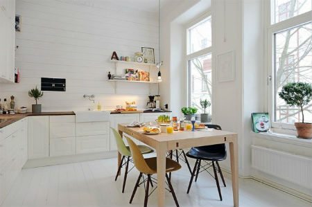Помещение кухни в шведском стиле обходится основным набором мебели, без излишеств: кухонной стенкой, обеденным столом и комфортными стульями.