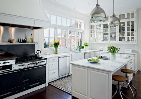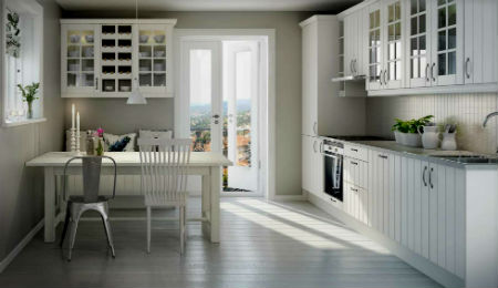 Стены кухни следует покрыть белой, влагоустойчивой краской, да и сам кухонный гарнитур может быть выполнен в белом цвете, подробнее о белой кухне можно почитать здесь. Обеденный стол может слегка контрастировать с оттенком основной мебели (гарнитура), поэтому в общую задумку вполне впишется стол, окрашенный в серый или коричневый тон. Что касается стульев, можно приобрести, как традиционные натуральные деревянные, так и стильные пластиковые стулья.