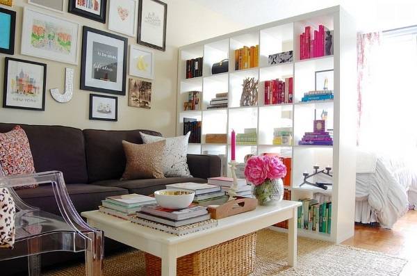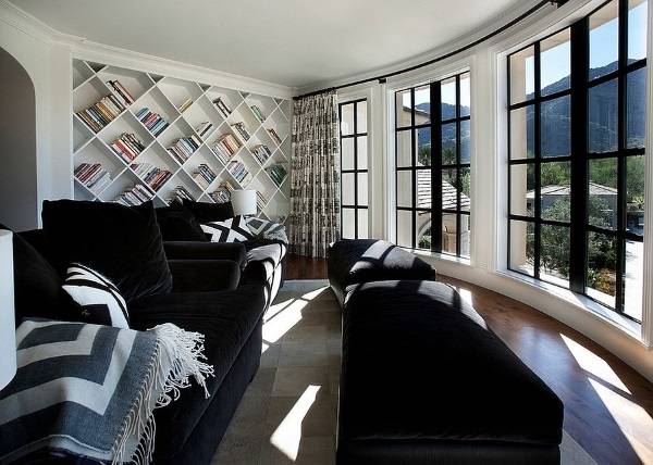 Добавление книжного шкафа в гостиную может звучать как очень простая и обыденная идея. Однако в 2015 году действует совершенно особая мода и если вы хотите быть в тренде, то должны выбрать для своей гостиной скульптурные навесные полки, встраиваемые в стену, либо открытые полки, устанавливаемые в качестве перегородок.