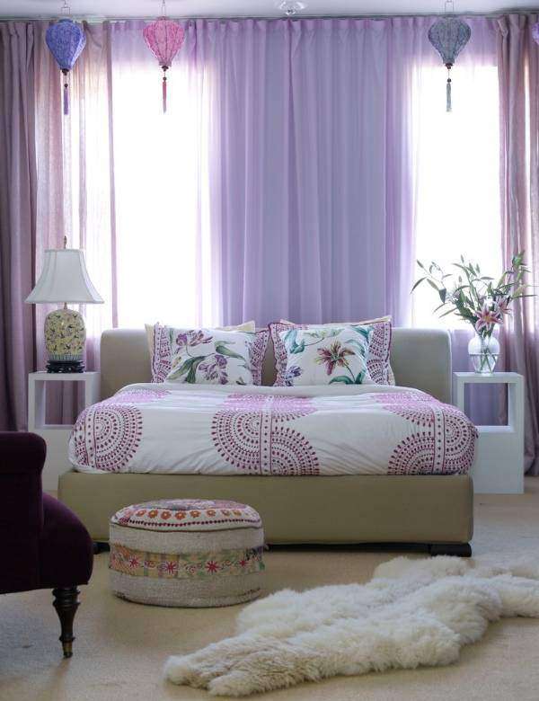 Фиолетовые шторы, покрывала и другие элементы спальни