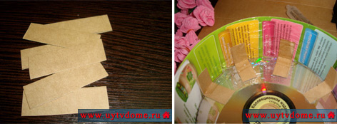 Приступаем к укреплению дна будущей шкатулки, нарезаем полосочки картона длиной 5 см, шириной 1 см, сгибаем их полам и клеим с внутренней части ко дну и стенкам изделия. Оставляем сушиться.