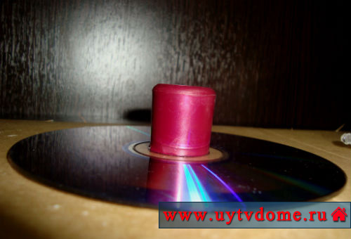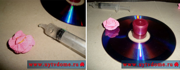 На диск клеим колпачок от старой губной помады (Вы также можете использовать колпачок от лака для ногтей, крышку от бутылки и прочее). Крышка с ручкой для будущей шкатулки начала чуточку преображаться, но этого недостаточно, поэтому приступаем к наклеиванию цветочков. На ножку цветка наносим обильный слой полимерного клея и приклеиваем цветок к внешней части диска, к нему следующий и так далее, до тех пор, пока крышка полностью не будет покрыта розочками. Получившиеся пробелы заполняем меньшими по размеру цветочками. Оставляем крышку сушиться.