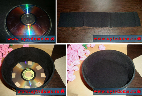 Прикладываем второй диск к черной ткани, карандашом или мелом создаем отметки, вырезаем получившийся кружок. От другого пласта черной ткани отрезаем полосу шириной 8 см, длиной 39-40 см (с запасом, лишнее лучше потом отрезать).  Клеим полоску с запахом на дно с внутренней части и нахлестом на внешнюю часть шкатулки (за цветочками этого нахлеста видно не будет). После чего клеим вырезанный черный тканевый кружок на внутреннее донышко изделия.