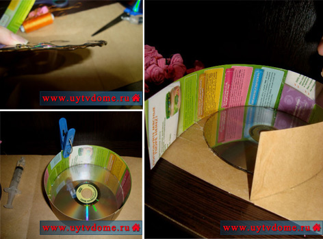 Далее на кромку диска наносим полимерный клей, приживаем к проклеенной поверхности полоску картона,  также наносим клей на соединительный шов, и прихватываем шов прищепкой. Оставляем сушиться.