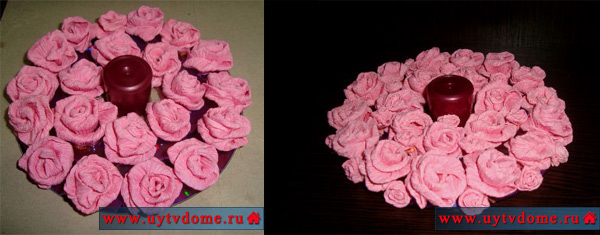 Приступаем к декору нижней части шкатулки из дисков. Клеить цветы начинаем снизу и по кругу, по аналогии с крышкой, когда изделие будет полностью покрыто розочками, пробелы заполняем мелкими цветочками. Оставляем изделие на ночь до полной просушки.