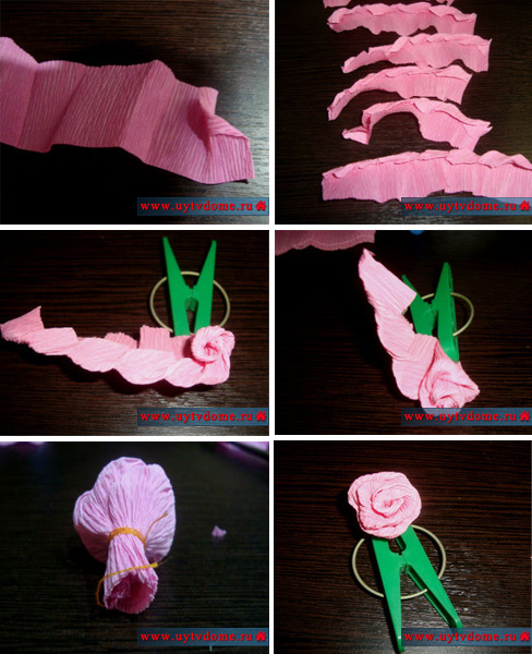 Нарезаем гофр. бумагу на неширокие полоски, к примеру длиной 10 см, шириной 3-4 см. Верхний край полоски подгибаем внутрь придерживая пальцем, сразу за ним захватываем небольшой участок бумаги и подкручиваем его книзу, затем не убирая пальца с предыдущей накрутки, прихватываем следующий участок бумаги и также подкручиваем его вниз. После всех этих манипуляций просто сворачиваем полоску, формируя бутон розочки, а чтобы он не распустился, подвязываем его с обратной стороны ниткой. Ниже данная информация представлена в видео-записи и на фото-коллаже, можете изучить.