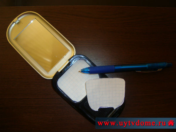 ● Берем простую бумагу, прикладываем к внутренним отсекам пудреницы и перерисовываем их очертания, вырезаем шаблоны. Вкладываем в отсеки пудреницы, чтобы убедиться, что размеры идентичны.