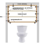 Для устройства придется вынести унитаз вперед, к стенам и на потолке прибить планки (40*40 мм вполне нормально будет), набить горизонтальные планки, которые будут удерживать полки. Дверки для такого шкафа в туалет крепятся непосредственно к стенам. Вернее, к планкам, которые закреплены на стене.
