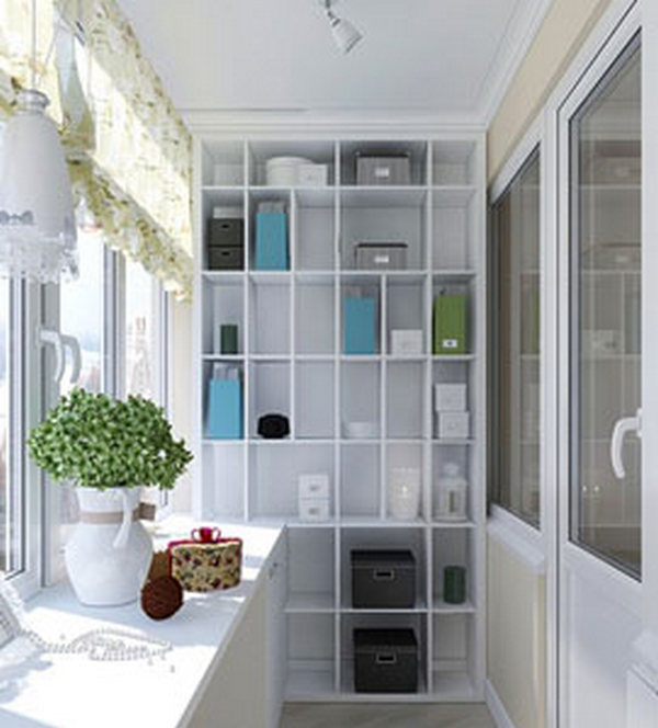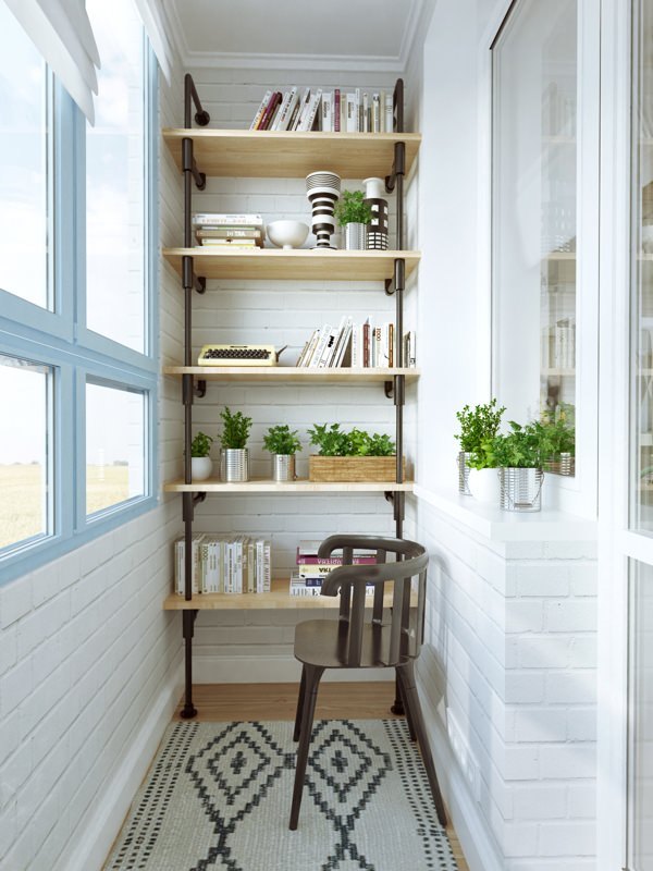 - Дизайн шкафчиков на миниатюрный балкон можно оформить в виде открытых стеллажей. Такое строение не будет скрадывать и без того маленькое пространство. Пример на фото: