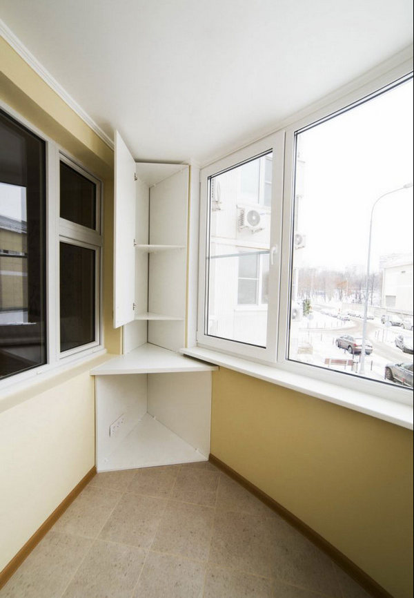 - Угловой шкафчик на балкон может скрасить некоторые неудобства в его строении. По сути, угол на балконе не несёт никакой пользы, но если застроить его стеллажами, картина становится более приятной, правда ведь?