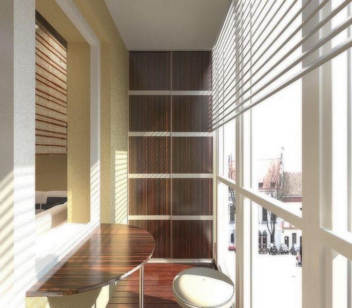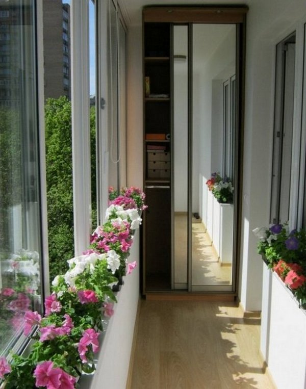 - Для длинного и узкого балкона больше подойдёт встроенная конструкция. В данном случае шкаф не будет мешать строению балкона, а если сделать его поверхность зеркальной — получится и вовсе красота. Смотрите на фото: