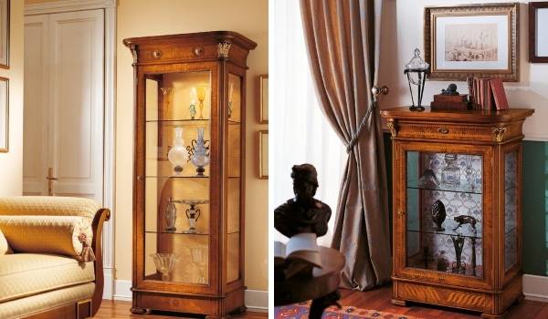 Существует 3 основных типа шкафов витрин, которые различают по их форме и конфигурации. Так, существуют витрины в виде высоких шкафов, широкие и низкие витрины (вроде комодов), а также узкие шкафчики средней высоты. Как правило, в интерьер приобретается либо большая витрина в виде шкафа, либо набор из 2−3 витрин комодов и тумб.