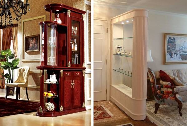 Прежде всего, как и любой другой шкаф, витрина для гостиной может стоять на полу, подвешиваться на стену либо встраиваться в интерьер. В отдельных случаях витрины даже выполняют функцию разделительных перегородок, показывая хранимые в них вещи сразу на две зоны помещения.