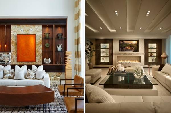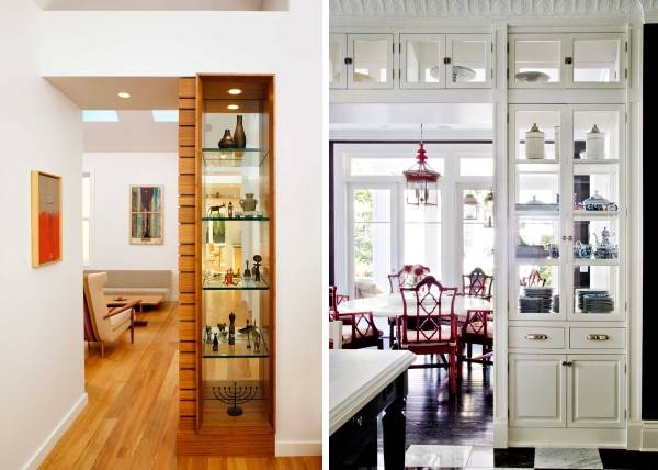 Витрина представляет собой шкаф с одной или несколькими стенками, выполненными из стекла либо какого-нибудь другого прозрачного материала (пластика, акрила), чтобы было видно хранящиеся в нем предметы. Сегодня шкафы витрины широко применяются не только в музеях, выставочных залах и магазинах, но и в жилых интерьерах. Если вы гордитесь своей коллекцией фарфора, хрусталя, сувениров, привезенных из заграницы, наград или настольного декора, то красивая витрина в гостиной позволит вам демонстрировать их своим гостям в наилучшем виде. Давайте же взглянем на фото интересных примеров оформления витрин в интерьерах!