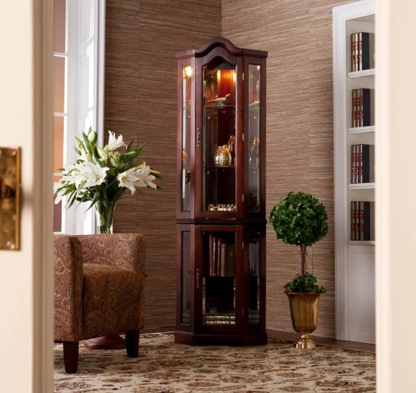 Угловая витрина для гостиной имеет сразу два преимущества: она занимает мало места и при этом бросается в глаза. Посвятим последние фото интерьеров в этой статье самому популярному виду витрин на сегодняшний день.