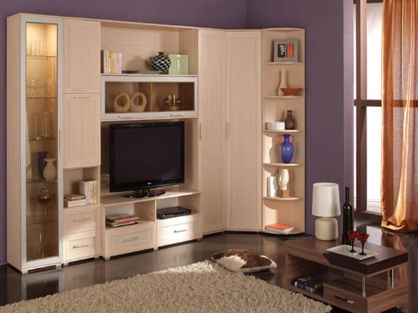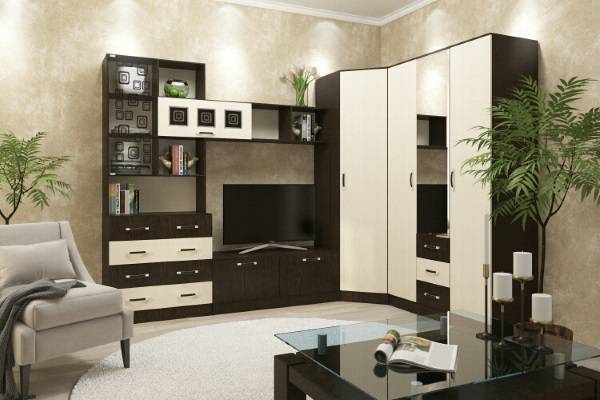 Если ваша гостиная небольших размеров, но вы решили установить в ней шкаф, то лучшим решением станет приобретение угловой модели. Таким образом, под внутреннее наполнение шкафа вы задействуете еще и угол комнаты, который при выборе стандартной прямоугольной модели был бы просто закрыт. Ниже на фото вы можете увидеть, как смотрится угловой шкаф в гостиной в интерьере квартиры.