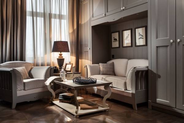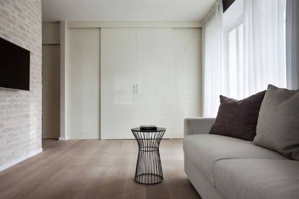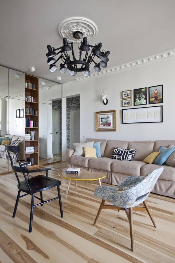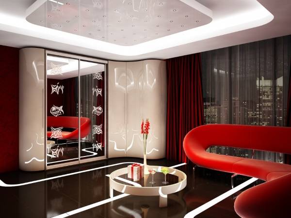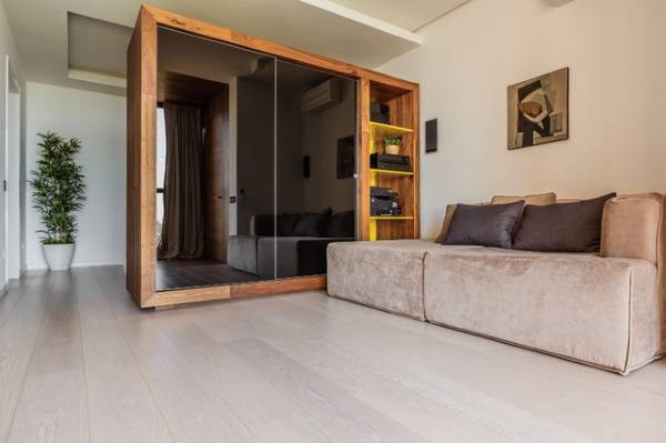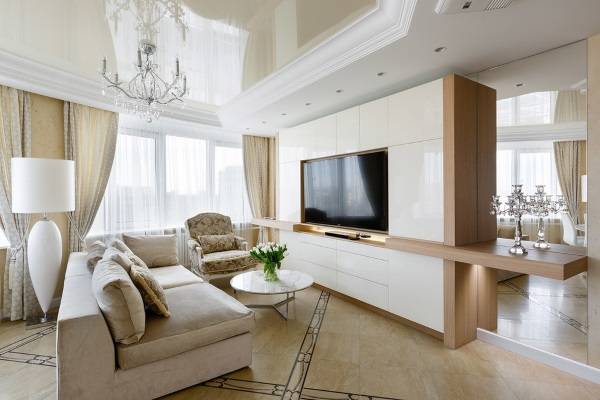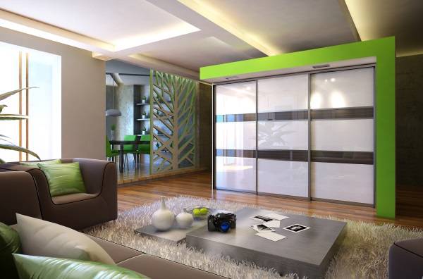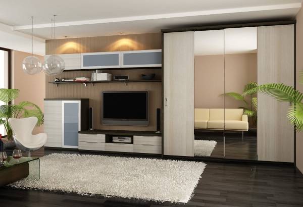 Вариант с зеркальной дверцей поможет визуально увеличить пространство в небольшой гостиной, а также сделать ее более светлой. Также можно создать «ложный» шкаф-купе за дверцей которого вместо полочек может быть скрыт дополнительный диванчик для гостей либо же рабочее место.
