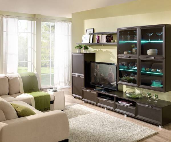 Если, обустраивая свою гостиную, вы остановили свой выбор на шкафе в гостиную во всю стену, то, как вариант, можно: