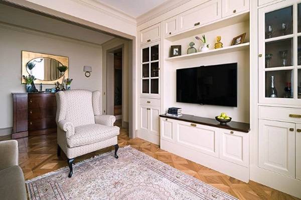 - выделить в нем специальное окошко под телевизор (либо замаскировать его дверцей);