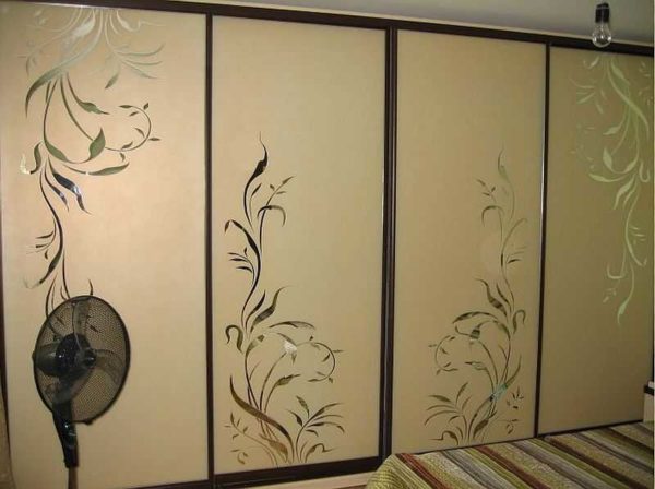 - Зеркало. Очень распространенный материал. На поверхность по пескоструйной технологии наносят рисунки. Они могут покрывать зеркало почти целиком, оставляя небольшие фрагменты нетронутого зеркала, а могут быть нанесены лишь фрагментами.