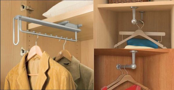 При ширине шкафа купе 45 см и менее, надо искать выдвижную конструкцию — поперечные (фронтальные) штанги, на которых вешалки висят параллельно двери, а не боком к ней. Подобные конструкции крепятся чуть выше уровня головы — так удобнее. Вам надо поднять руку и повесить вешалку. Потому примерно на этом уровне крепится полка, а к ней уже штанга.