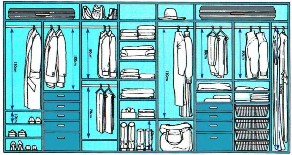 Высота этих отделов зависит от того, что вы планируете тут хранить. Под плащи, пальто, шубы отделения делают 130-150 см в зависимости от роста хозяев. Под пиджаки, куртки и другую. подобную одежду отводя 90-120 см.