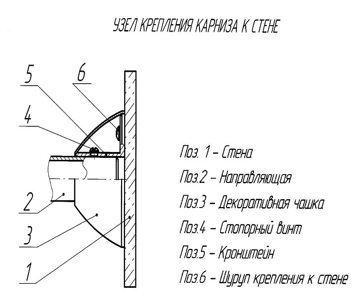 Все карнизы, как правило, прикрепляются к стенам. Но иногда размеры карниза или его сложная форма не позволяют так его закреплять, поэтому в этом случае карниз крепят еще и к потолку, прикрывая потолочные крепления декоративными отражателями.